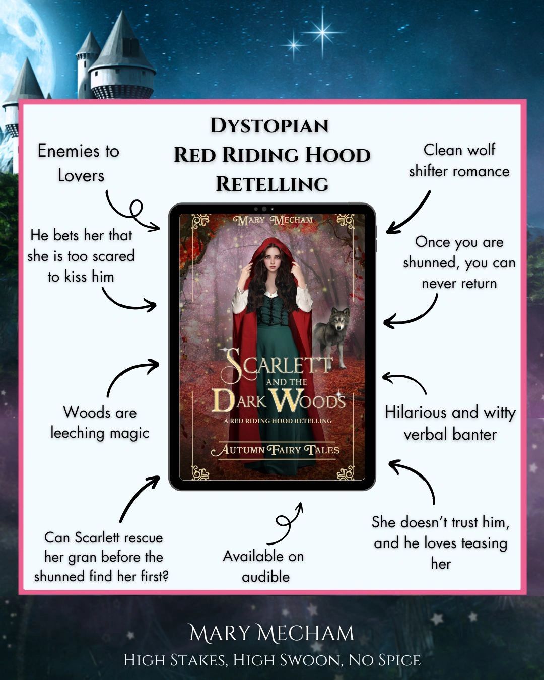 Scarlett’s efforts came too late. As her magic dwindles the farther into the forest she ventures, she becomes hopelessly lost, and is forced to accept help from Greyson, the shapeshifting wolf who is stalking her every footstep—and who Scarlett suspects of knowing Gran’s location.